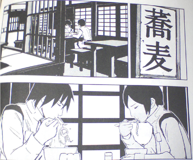 和風な空間で蕎麦を食べる長道と同級生イザナ。